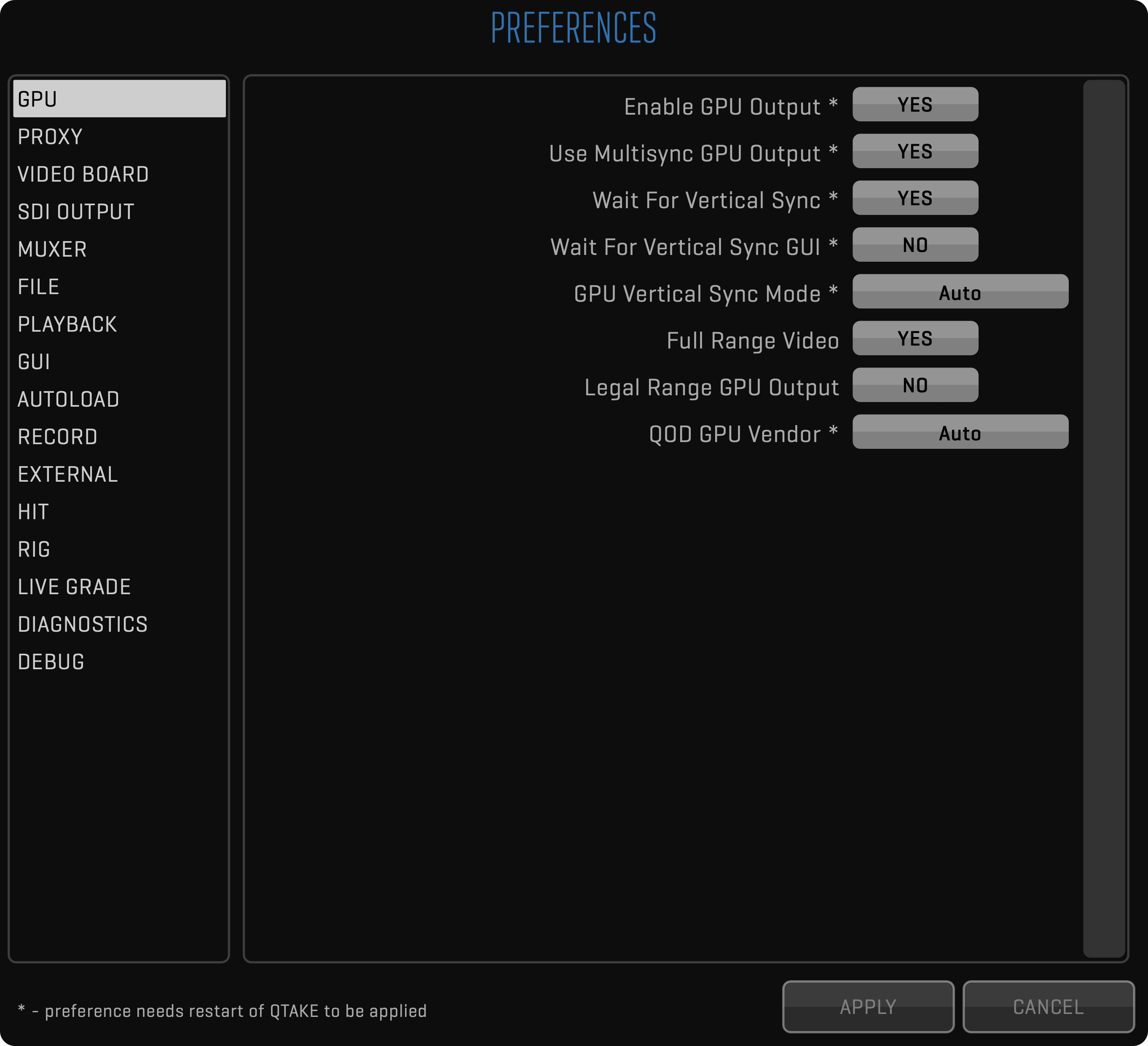 After selecting the required version, click the CLOSE button to restart QTAKE application using the new configuration. In addition to the number of cameras and 4K mode, two preferences are dependent on the version selected: