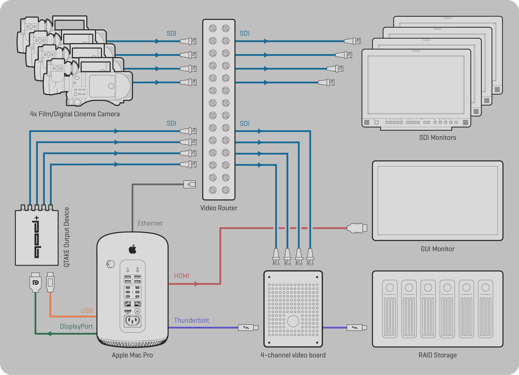 QTAKE works with a multitude of Apple Mac computers, video cards, audio devices, and GPU output converters. Listed below are recommended hardware configurations for HDx1, HDx2, HDx4 (4Kx1) and HDx8 (4Kx2) version of QTAKE.