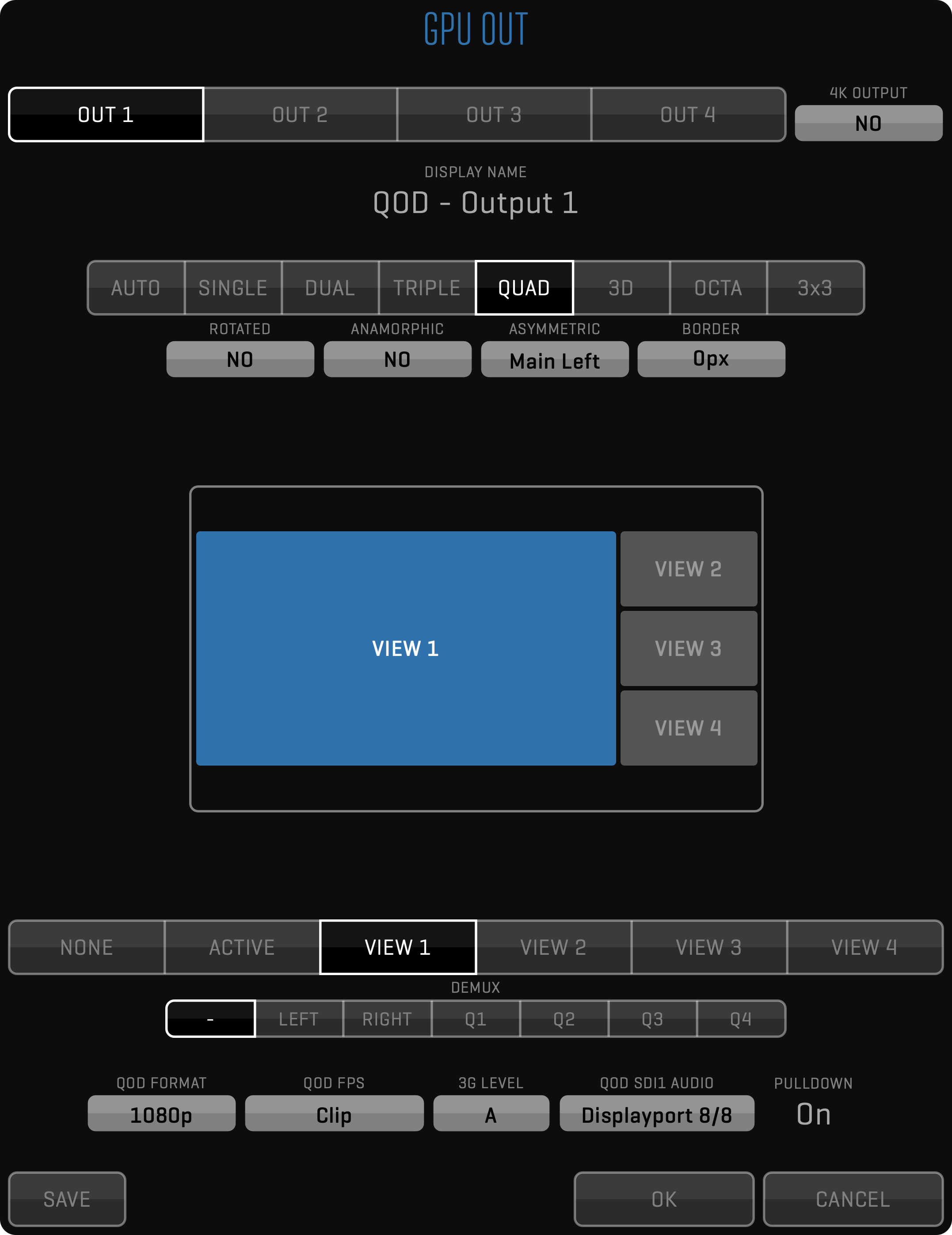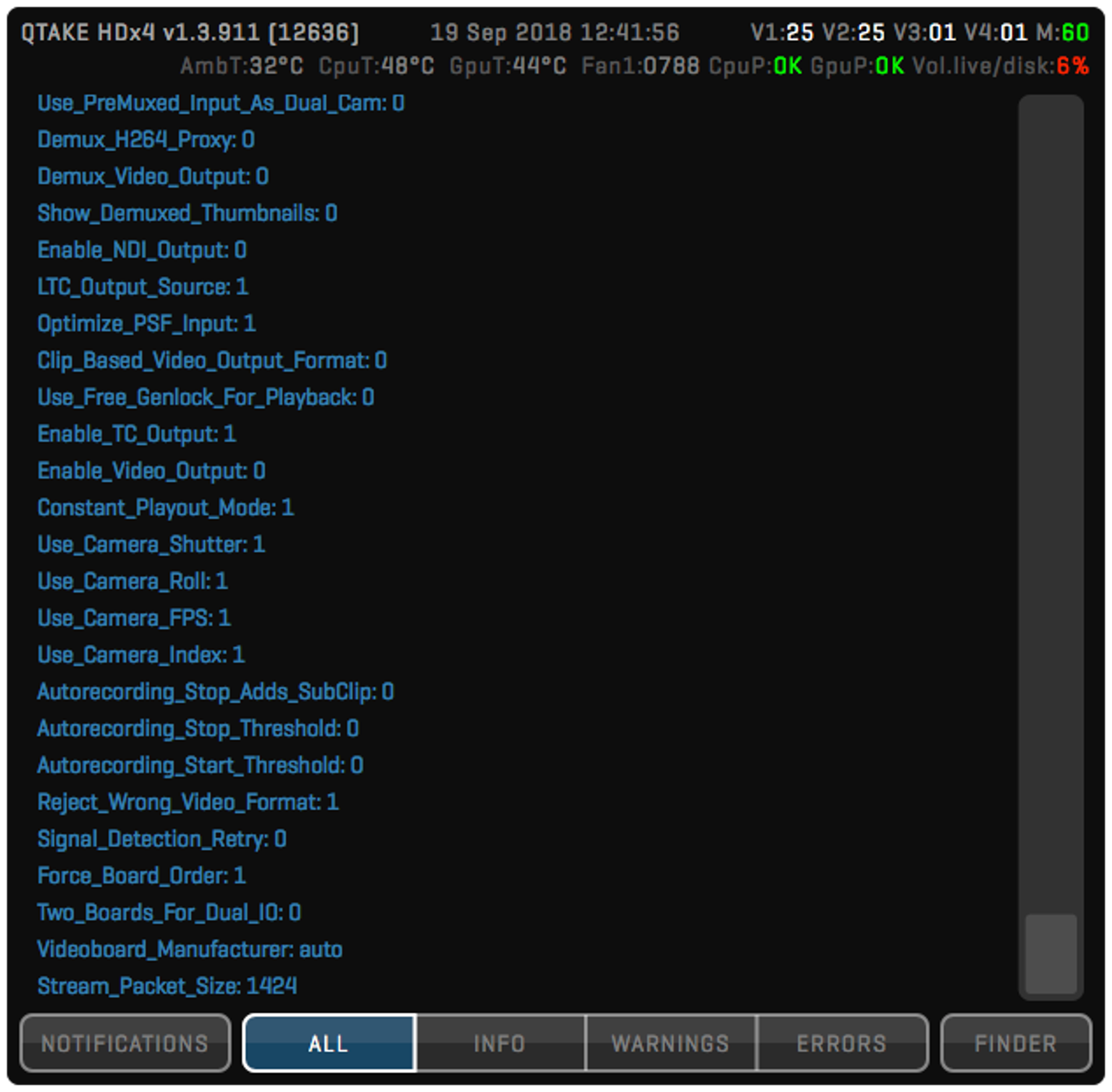 Unlike QTAKE 1.4, where each version (HDx1, HDx2, HDx4, …) was a different application bundle (executable), QTAKE 1.5 is a single app. Switching between single, dual, four, and eight cameras and 4K mode is now done inside the application. Long-click the QUIT button to open the version dialog:
