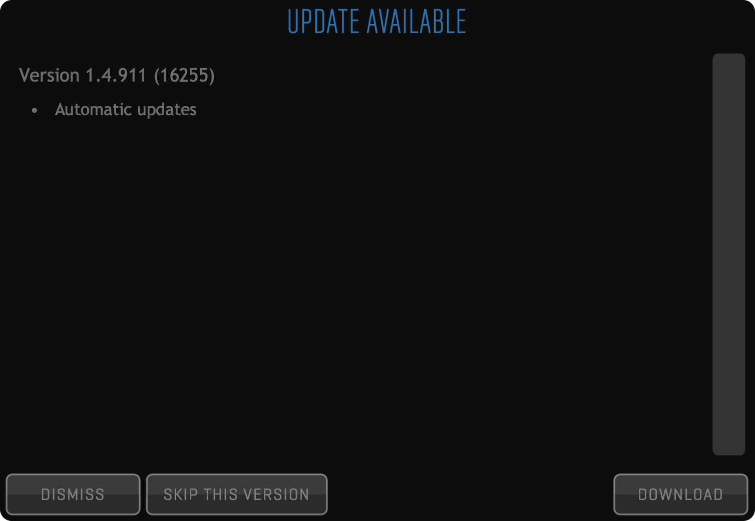 Here you can dismiss the notification or show the update. If you decide to proceed, a dialog with UPDATE details will pop up: