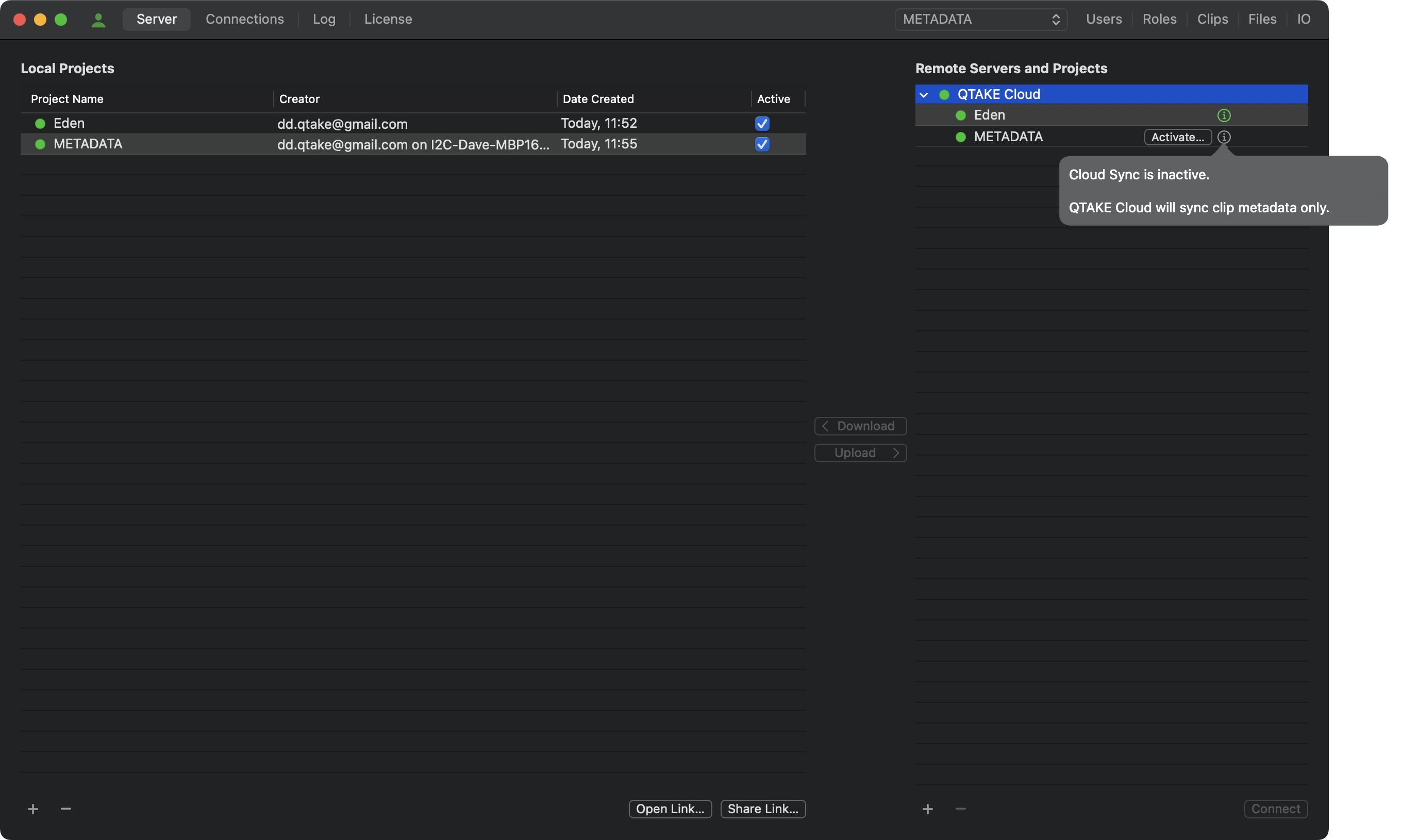 The Server tab lists local and remote projects and lets you synchronize projects between multiple QTAKE Server applications. The main program area is divided into two columns. The left column lists local projects. These projects have been either created through QTAKE Server, uploaded from QTAKE, or synchronized from another QTAKE Server. In the Creator column, you can find the email of the user who created the project.