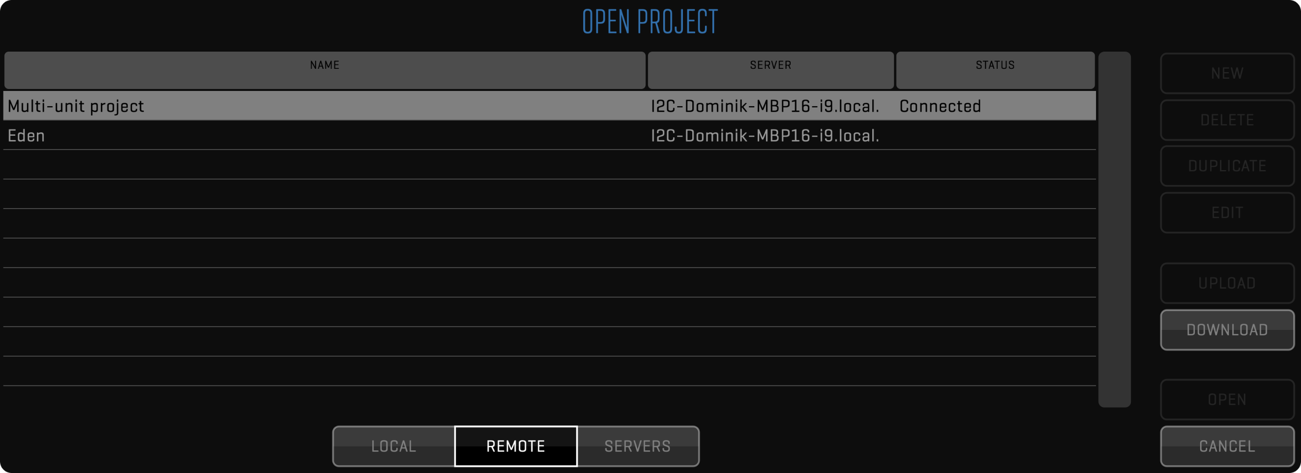 To add a server that is not on the local network or has disabled the Bonjour service (see the ENABLE BONJOUR SERVICE section above), click the plus sign (+) at the bottom of the Remote Servers and Projects list. You will then have to manually enter the IP address or the hostname of the remote server to add.